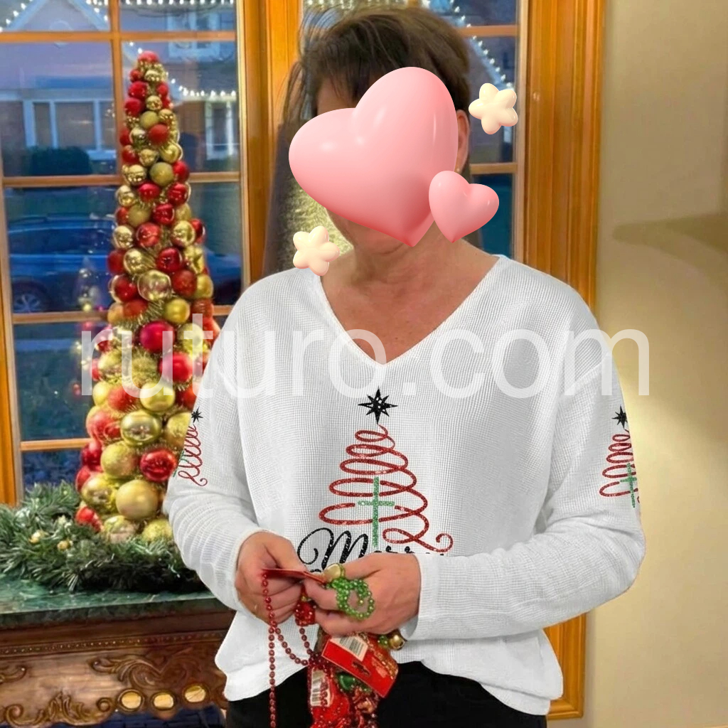 Yes!It runs true to the garment size chart please choose your size based on your measurements.Elevate your holiday wardrobe with this versatile casual top featuring a charming Christmas tree print. The classic white base pairs effortlessly with your existing pieces, while the flattering V-neckline offers a refined silhouette suitable for both festive gatherings and everyday wear. The thoughtfully placed print adds seasonal character without overwhelming your look. Crafted for comfort and style, this piece transitions seamlessly from casual outings to holiday celebrations, making it an essential addition to your seasonal collection.
