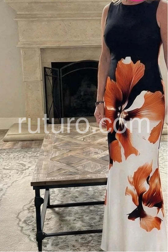 Elegant Round Neck Sleeveless Floral Print Maxi Dress
