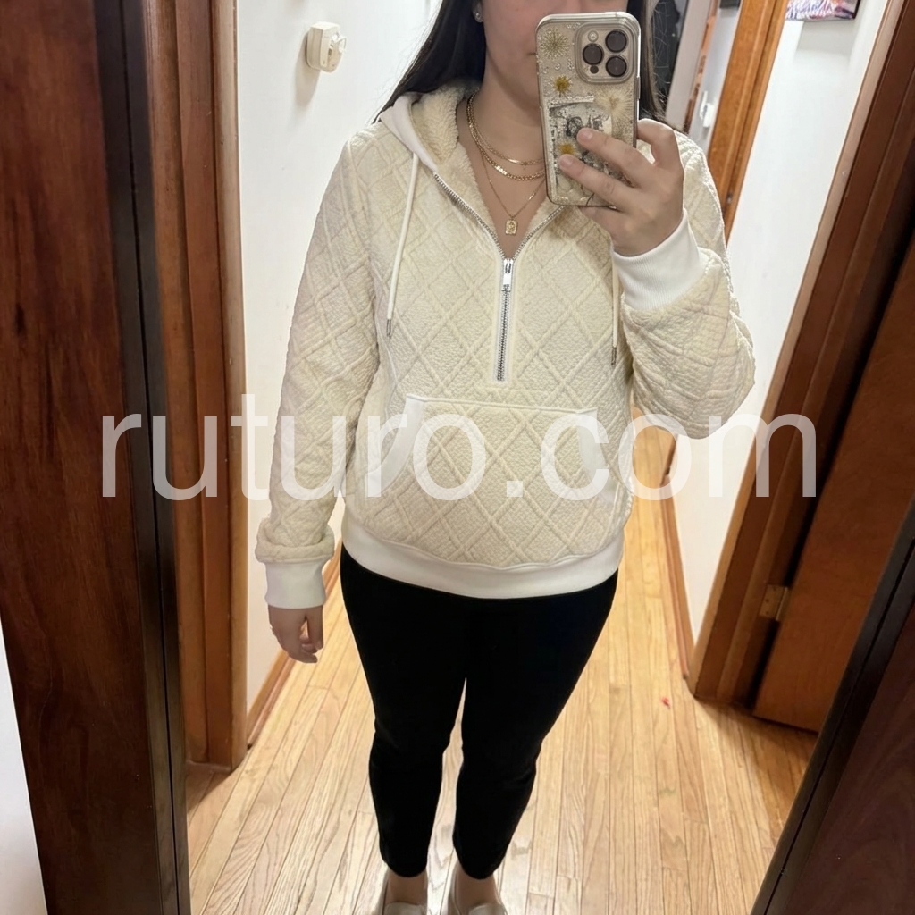 Yes!It runs true to the garment size chart please choose your size based on your measurements.Elevate your casual wardrobe with this sophisticated beige quilted sherpa half-zip hooded sweater. The combination of quilted detailing and plush sherpa lining creates exceptional warmth without excess bulk, making it ideal for layering or wearing solo. The half-zip design offers versatile styling options and easy temperature adjustment, while the integrated hood provides additional coverage on cooler days. Perfect for transitional seasons or as a lightweight layering piece, this sweater balances comfort with refined aesthetics for the discerning wearer.