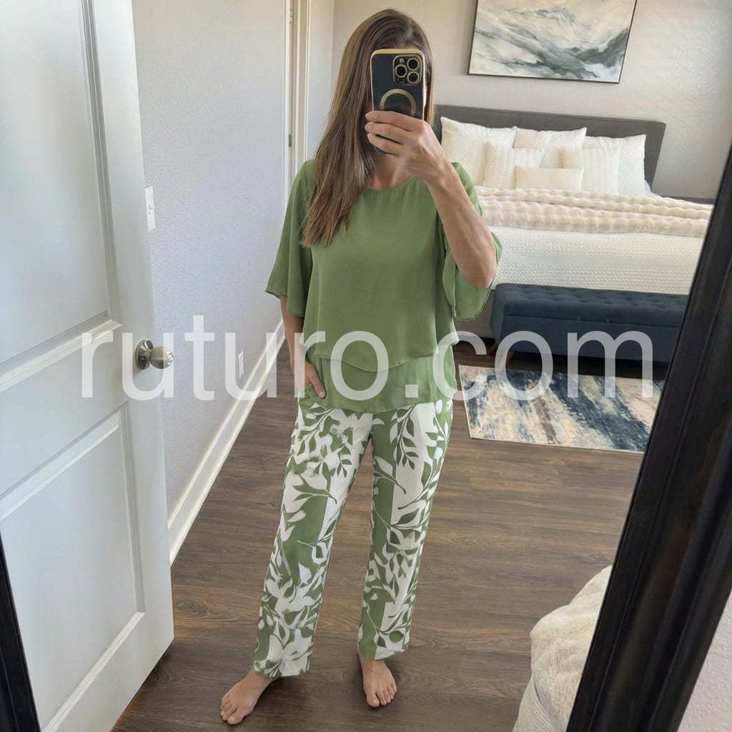 Trendy Green Print 3/4 Sleeve Two Piece Set